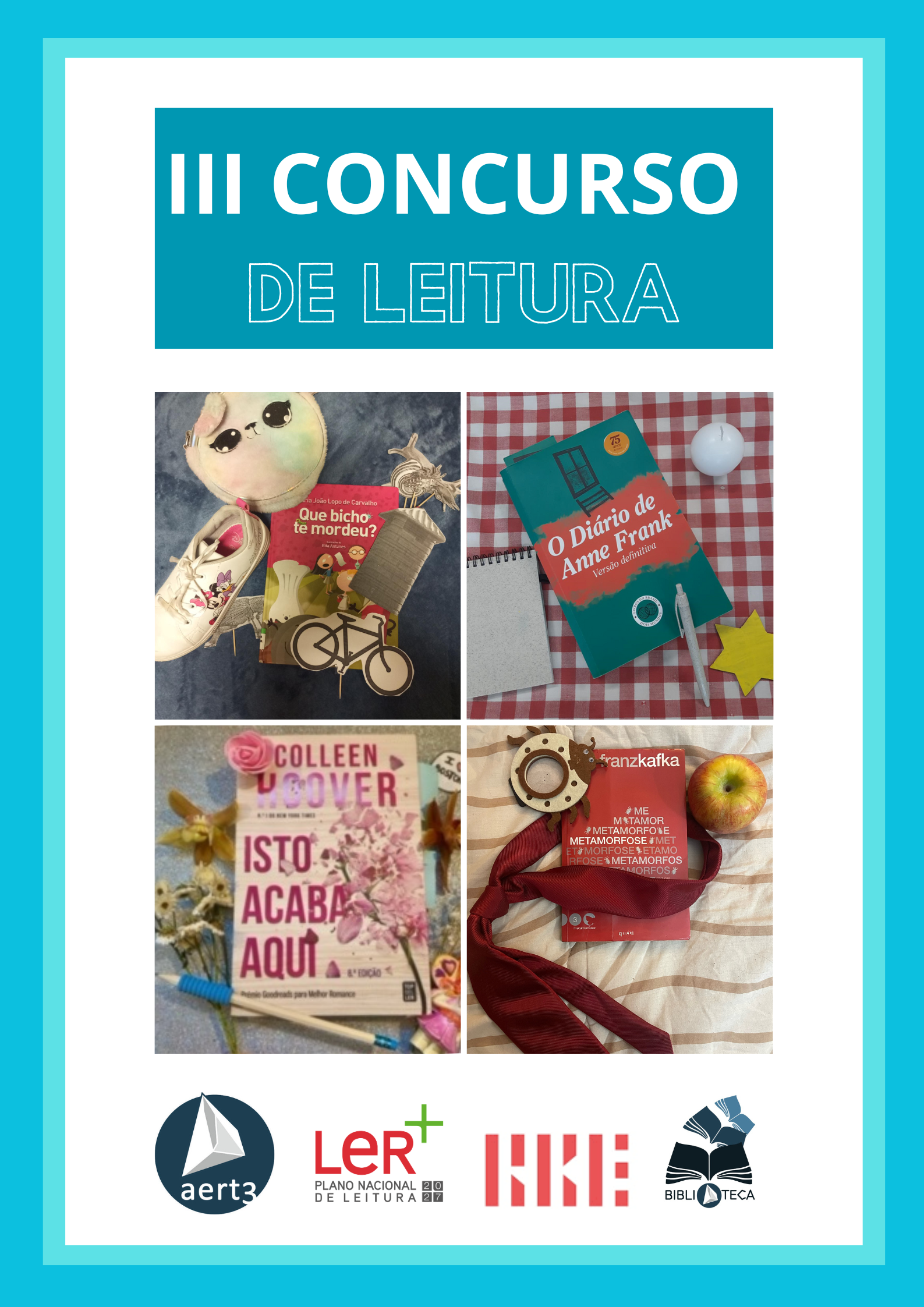 Decorrerá até março o III Concurso de Leitura do AERT3. Para participares basta escolheres um livro - o teu favorito! - e de três a seis objetos que se relacionem com ele. Fazes um vídeo ondes expliques o enredo e porque é que, na tua opinião, todos devem ler esse livro e tiras uma fotografia ao livro e aos objetos que escolheste, como vês no cartaz.